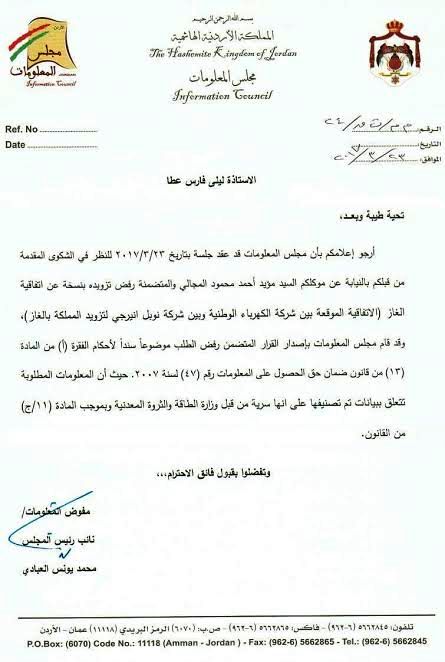 وأوضحت المحامية هالة ذيب أن مجلس المعلومات رفض الشكوى على وزير الطاقة موضوعاً، معتبرا أن المعلومات المطلوبة تتعلق ببيانات تم تصنيفها على أنها سرية من قبل وزارة الطاقة والثروة المعدنية.