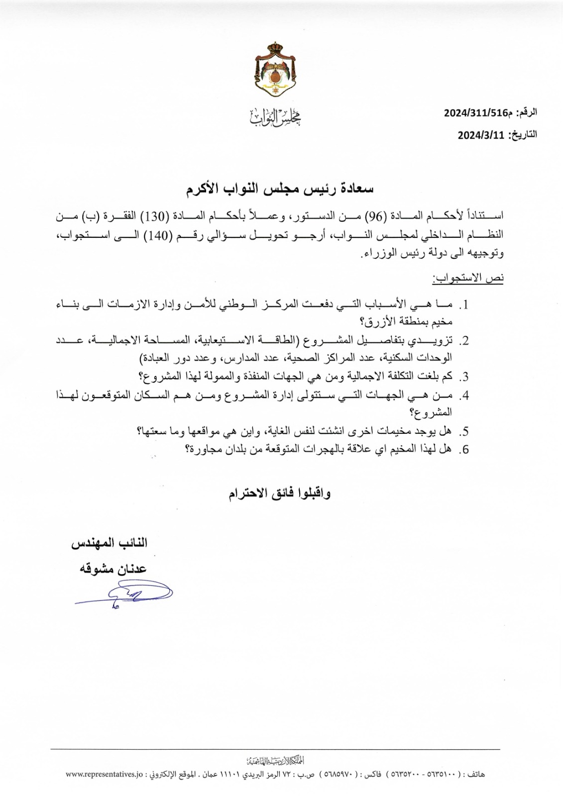 حول النائب عدنان مشوقه سؤاله النيابي حول بناء مخيم الأزرق الموجه الى رئيس الوزراء الى استجواب، وذلك بسبب "تأخر" إجابة الحكومة حسب كتابه الموجه الى رئيس مجلس النواب