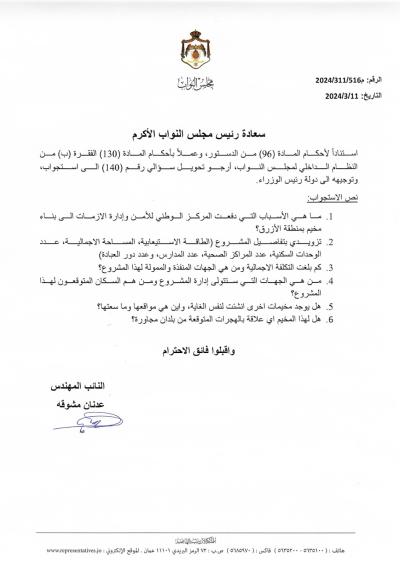 وكان مشوقه قد تسأل عن الأسباب التي دفعت المركز الوطني للأمن و إدارة الازمات الى بناء مخيم في منطقة الأزرق، وتكلفة المشروع والجهة الممولة، والطاقة الاستيعابية، وغيرها من التفاصيل.