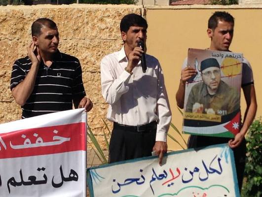 قدم متضامنون مع قضية الأسرىالأردنيين في سجون الاحتلال التهنئة بعيد الفطر لأهالي الأسرى صباح الخميس أثناء وقفتهم أمام بوابة القصور الملكية من جهة شارع الاستقلال.