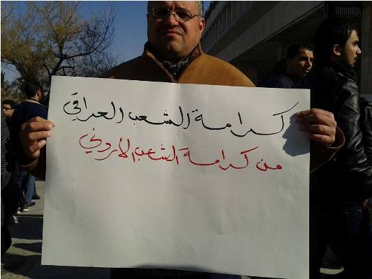 ورفع المشاركون القادمون من مختلف محافظات المملكة، شعارات تندد بالحملات الأمنية التي تقودها حكومة رئيس الوزراء العراقي نوري المالكي، ومنها: "كرامة الشعب العراقي من كرامة الشعب الأردني"... "قادمون يا بغداد"... "لا للظلم.. لا للاقتتال الطائفي"... "هبوا لتحرير العراق".. "نعم للحرية الشعبية المسؤولة.. نعم للمقاومة"...