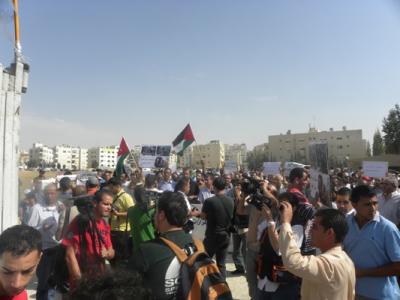 وردد المعتصمون الذين قام عدد كبير من القوات الأمنية بتطويق اعتصامهم، هتافات منها "الرابية بدها تحرير من السفارة والسفير"..