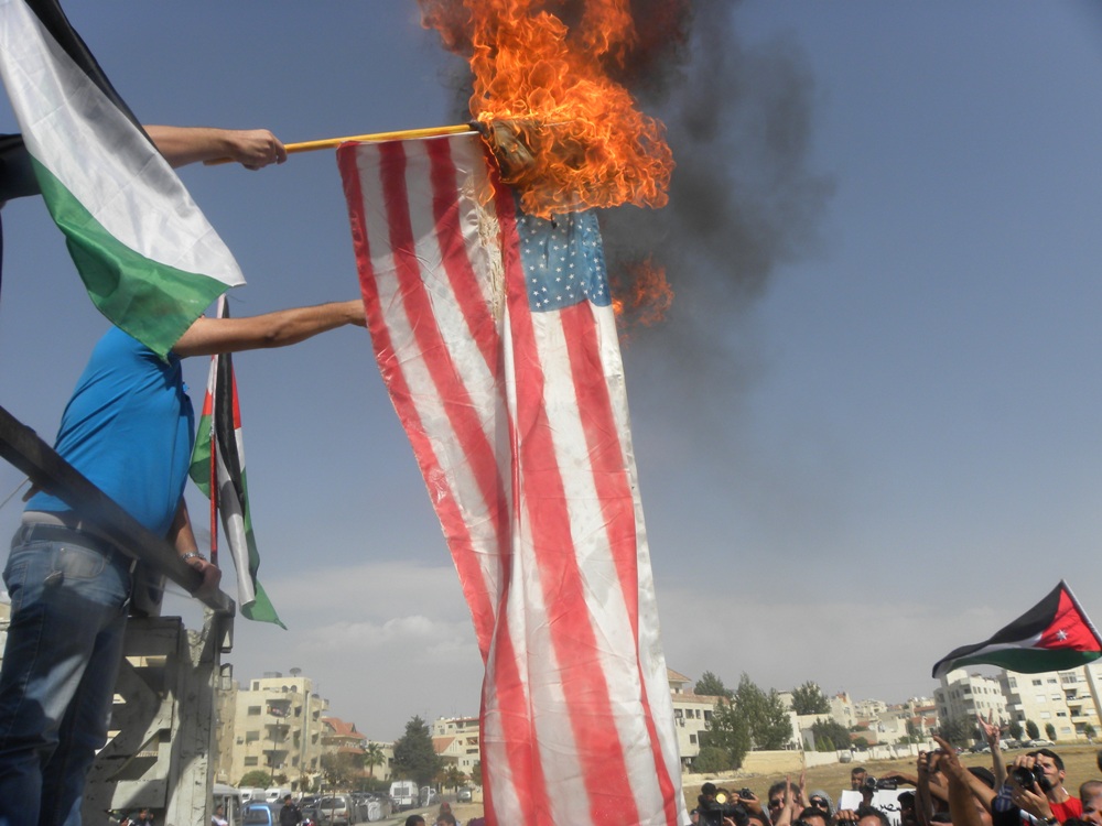 وقام المشاركون بإحراق العلمين الأمريكي والإسرائيلي , وختموا الإعتصام بنشيد موطني.