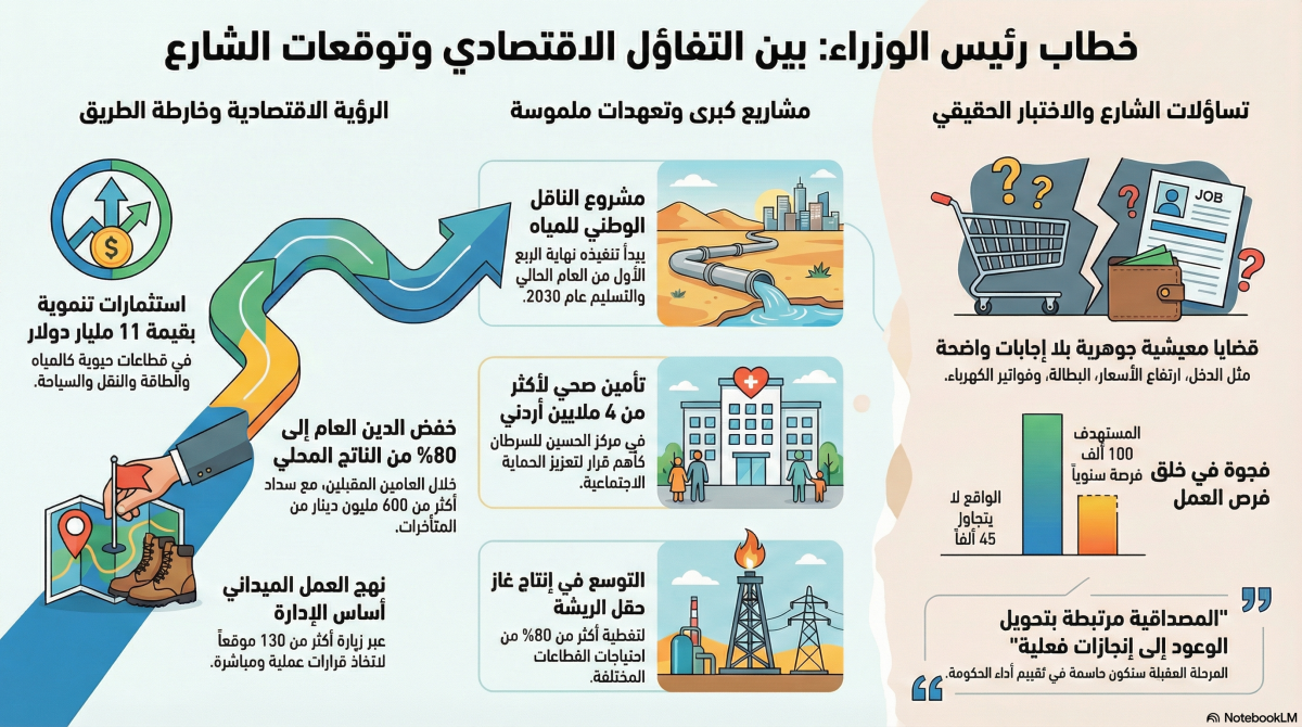 ويشير الدعجة إلى أن التركيز الواضح في الخطاب كان اقتصاديا، في اعتراف غير مباشر بأن الأزمة الاقتصادية تشكل التحدي الأكبر الذي يواجه الدولة حاليا، وأن نجاح الحكومة سيقاس بمدى قدرتها على تحويل هذه المشاريع إلى أثر ملموس ينعكس على معيشة المواطنين.