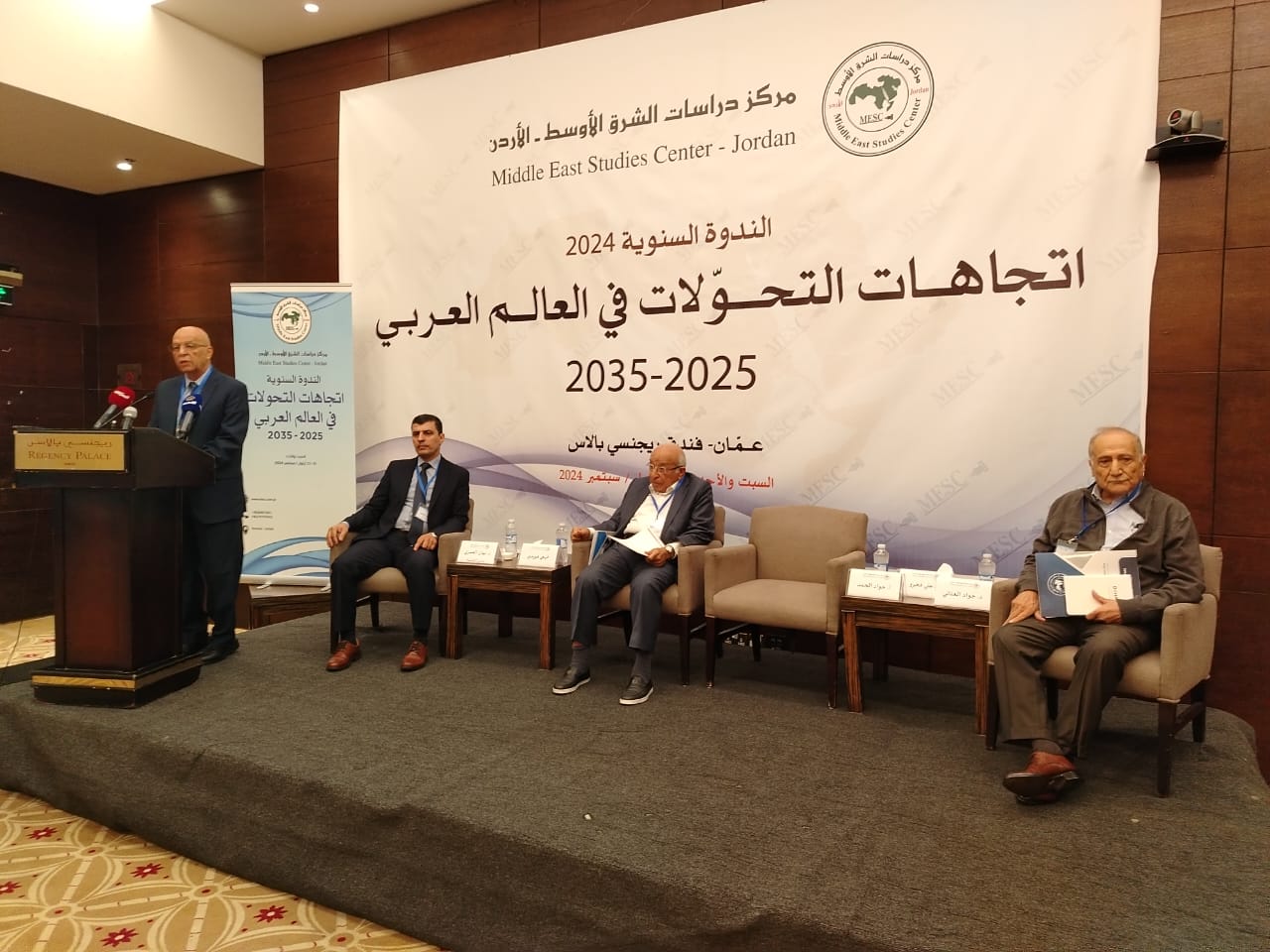 وأشار رئيس مركز دراسات الشرق الأوسط جواد الحمد في كلمة له خلال جلسة الافتتاح إلى ما يمر بالعالم العربي من تحولات كبرى على صعيد كافة مكوناته من الحكومات والقوى السياسية والاجتماعية وبناه الداخلية بما في ذلك الحراك السياسي والانتخابات من جهة، والحروب الأهلية البينية وفي مواجهة المجموعات الإرهابية المصنوعة من جهة أخرى، وفي ظل انقسامات مجتمعية عمودية وأفقية في عدة دول عربية، إضافة إلى الحرب الإسرائيلية على غزة والضفة الغربية ولبنان التي كشفت عن عمق العجز والضعف وسوء التقدير لدى الكثير من النخب الحاكمة العربية في التعامل مع الصراع العربي- الإسرائيلي والقضية الفلسطينية واستراتيجياته، وكذلك في قصور برنامج الدعم المفترض لصمود الشعب الفلسطيني المناضل ضد الاحتلال وفي ظل انقسام الحكومات العربية في التعامل مع الاحتلال الإسرائيلي.