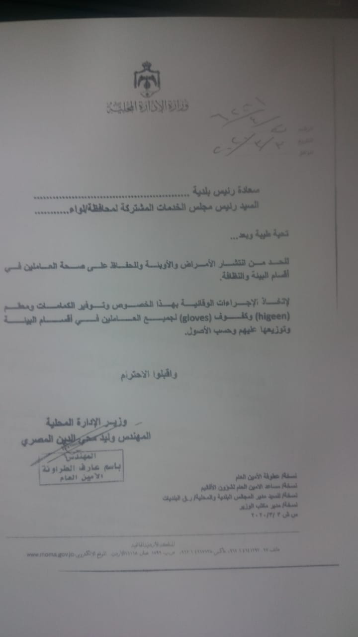 حيث وجه لرؤساء البلديات ومجالس الخدمات المشتركة بناء على كتاب نائب سمو رئيس المركز الوطني للامن وادارة الازمات وقرارات وتوصيات اللجنة التنفيذية ( فيروس كورونا) في اجتماعها الاخير للاطلاع والعمل بمضمون الكتاب.