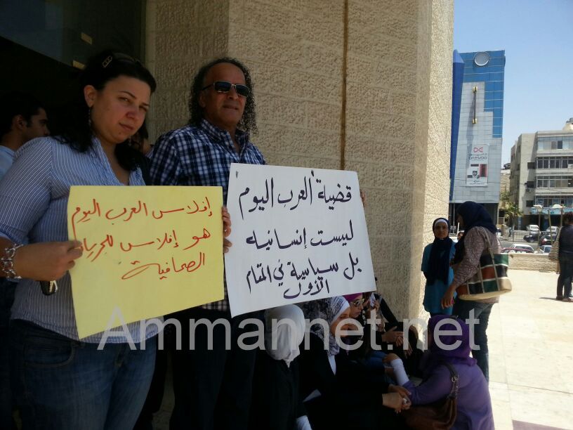ورفع المشاركون عدة شعارات منها "افلاس العرب اليوم هو افلاس للحريات الصحافية"، "صاحبة الجلالة الصحافة في خطر انقذها يا صاحب الجلالة"، "قضية العرب اليوم ليست انسانية بل سياسية في المقام الأول".