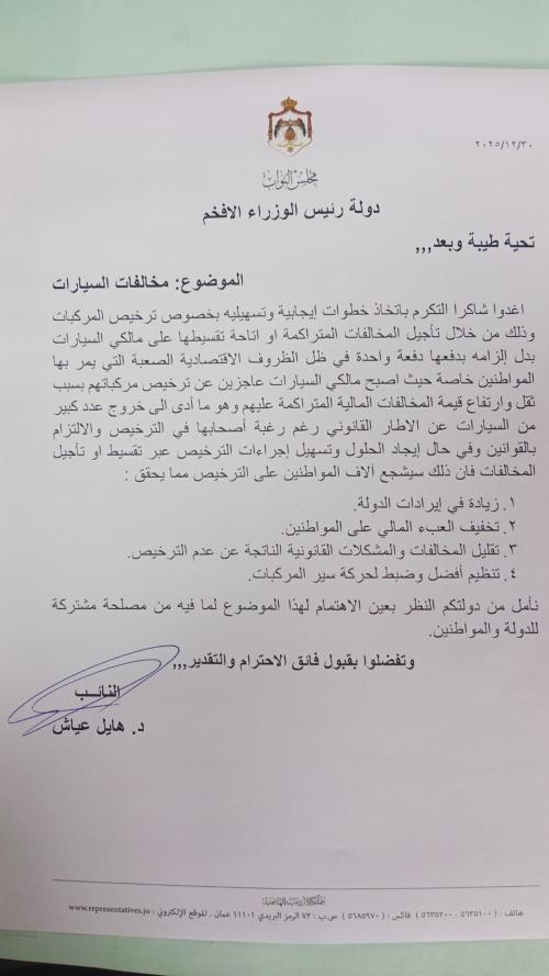 وجه النائب الدكتور هايل عياش مذكرة رسمية إلى رئيس الوزراء ، يطالب فيها الحكومة باتخاذ خطوات إيجابية وتسهيلية فيما يخص إجراءات ترخيص المركبات، وذلك عبر إتاحة خيار تقسيط المخالفات المتراكمة أو تأجيلها بدلاً من إلزام المواطنين بدفعها دفعة واحدة كشرط للترخيص.