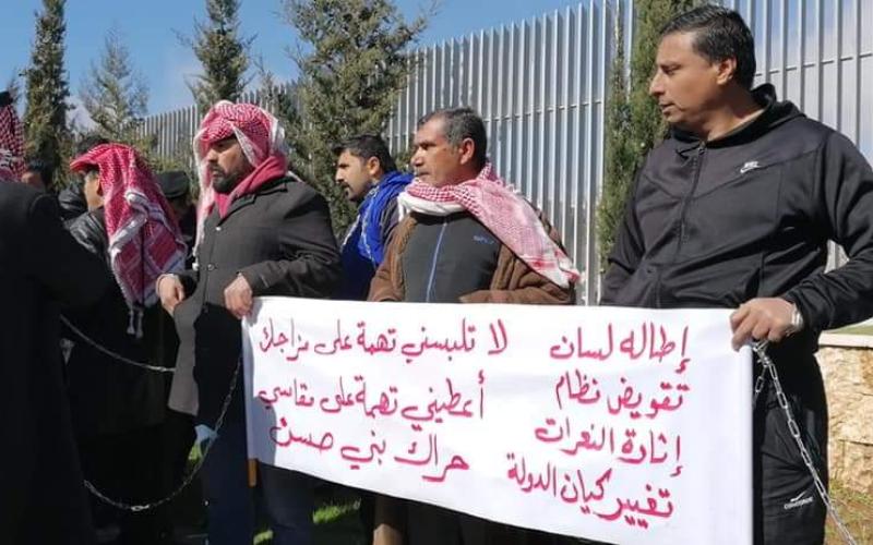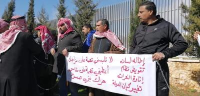 في خطوة احتجاجية قام العشرات من حراك أبناء قبيلة بني حسن اليوم الأربعاء بتقييد أنفسهم بالسلال أمام دائرة المخابرات العامة لتسليم أنفسهم دفعة واحدة إحتجاجاً على اعتقالات طالت أبناء حراك أبناء قبيلة بني حسن .