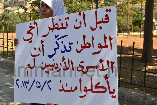 فيما يواصل أهالي الاسرى اعتصاماتهم ووقفاتهم أمام مختلف الدوائر والتي تجاوزت 150 وقفة منذ بداية الإضراب مطلع أيار الماضي، حيث نفذوا وقفة يوم الثلاثاء أمام مجلس النواب مطالبين المجلس برفع مذكرة و مقابلة الملك للتدخل بقضيتهم وإنهاء معاناة أبنائهم، خصوصا بعد أن باتوا يؤمنون بأن رجال الحكومة من رئيسها النسور ووزير خارجيتها ناصر جودة وسفيرها في تل ابيب لا يقدمون و لا يأخرون في هذا الملف.