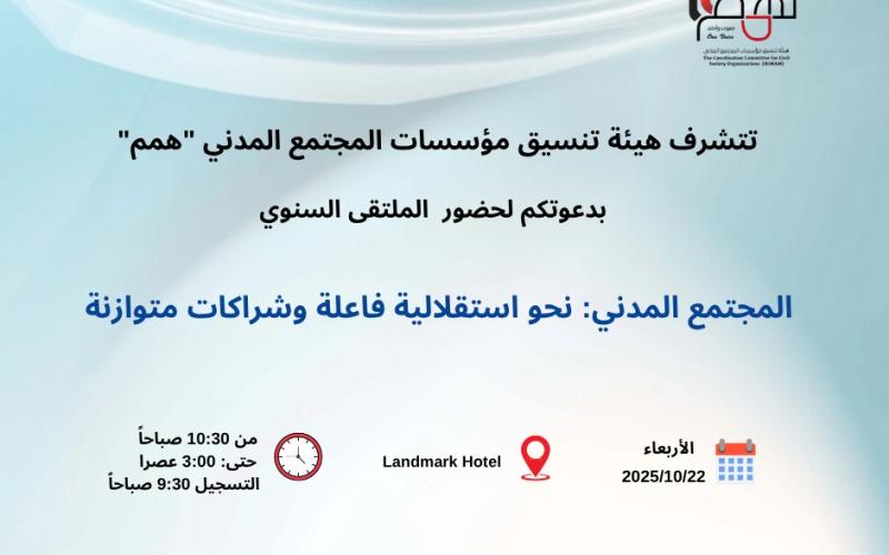 أعلنت هيئة تنسيق مؤسسات المجتمع المدني "همم" عن تنظيم الملتقى السنوي الخامس تحت عنوان "المجتمع المدني: نحو استقلالية فاعلة وشراكات متوازنة"، وذلك يوم الأربعاء الموافق 22 تشرين الأول/أكتوبر 2025، الساعة 10:30 صباحًا، في فندق لاندمارك – عمّان.
