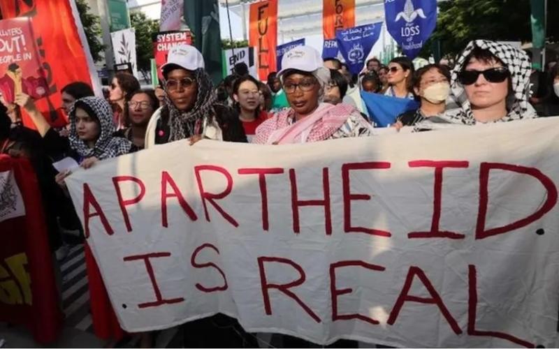 وتوحدت مطالب المحتجين بين البيئية والفلسطينية، حيث كان بالإمكان رؤية لافتات تدعو إلى "وقف الاستعمار المناخي" و"إنهاء استخدام الوقود الأحفوري" إلى جانب أخرى كُتب عليها "وقف إطلاق النار الآن" و"إعادة الأرض" و"حقّ العودة" وقد زُينت بألوان العلم الفلسطيني، إضافة إلى "إنهاء الاحتلال".
