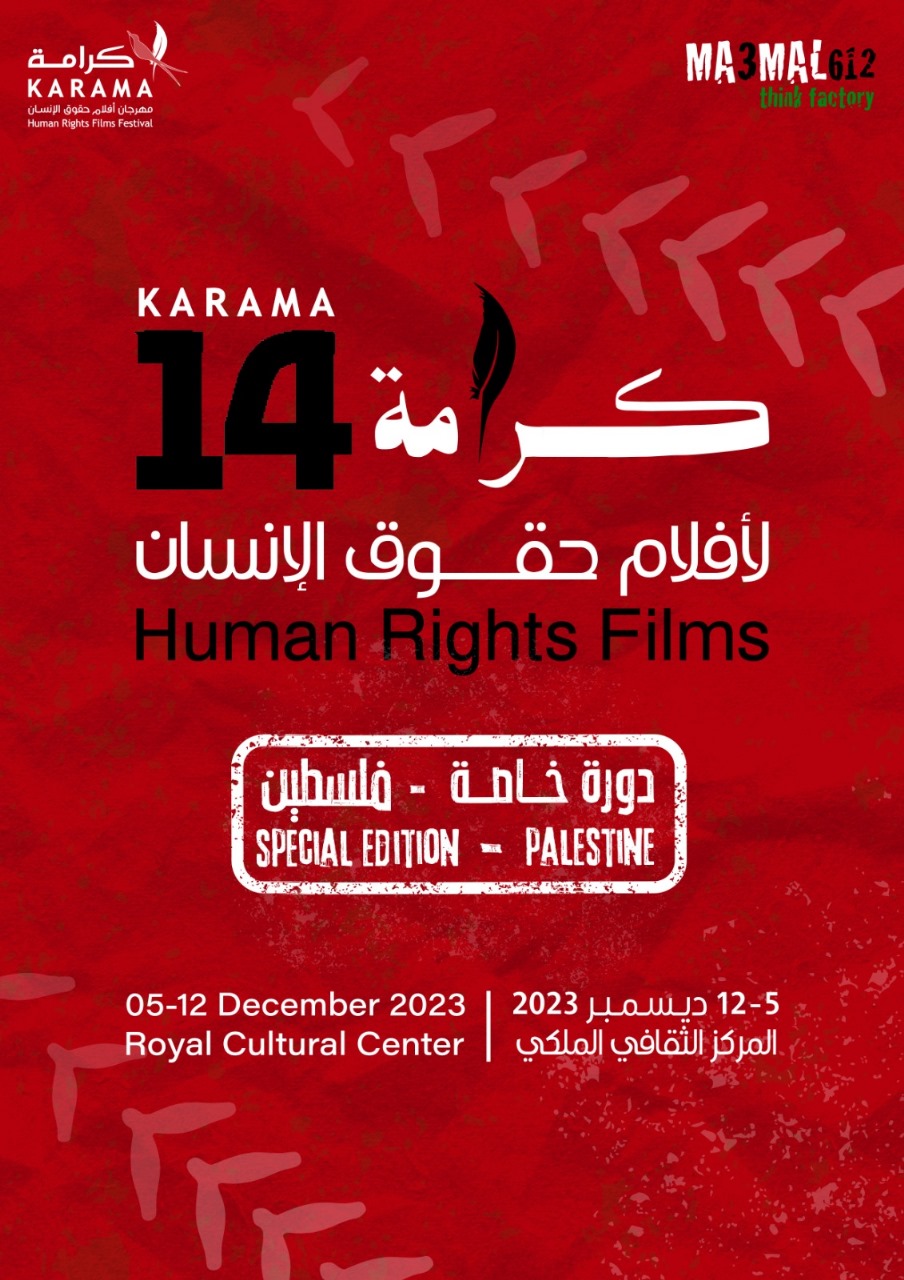 بشكل استثنائيٍّ تفاعليٍّ مخصصٍ (أساسًا) لِفلسطين وآلام شعبها ونضالاتهم وتطلعاتهم في الضفة والقطاع، تنطلق في السابعة من مساء اليوم (5 ديسمبر/ كانون الأول 2023)، في المركز الثقافي الملكي في العاصمة الأردنيّة عمّان، فعاليات الدورة 14 (دورة فلسطين) من مهرجان "كرامة لأفلام حقوق الإنسان"، متواصلةً حتى 12 الشهر الحالي (ديسمبر/ كانون الأول 2023).