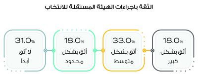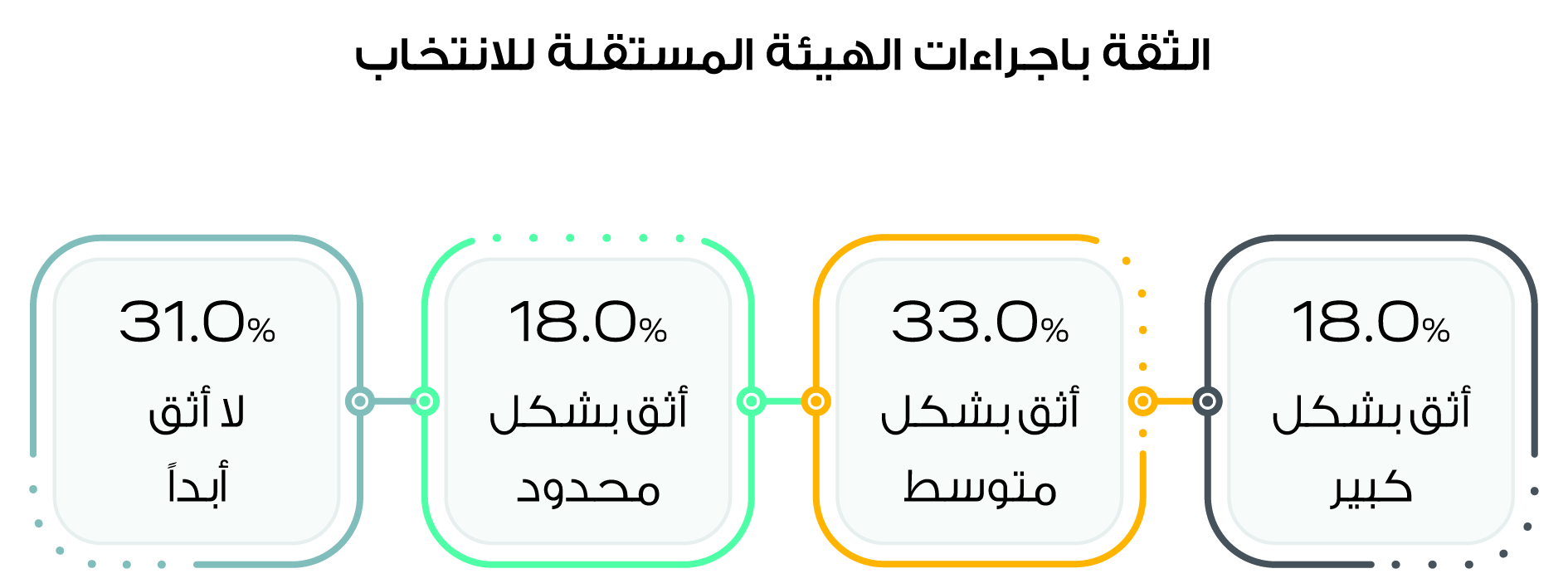 أما بما يتعلق بثقة الناخبين والناخبات بإجراءات الهيئة المستقلة للانتخاب فقد وصلت نسبة الذين يثقون بإجراءات الهيئة بشكل كبير إلى 18%، فيما وصلت نسبة الذين يثقون بشكل متوسط إلى 33%، بينما الذين يثقون بشكل محدود فقد وصلت نسبتهم إلى 18%، بينما كانت نسبة الذين لا يثقون 31%.