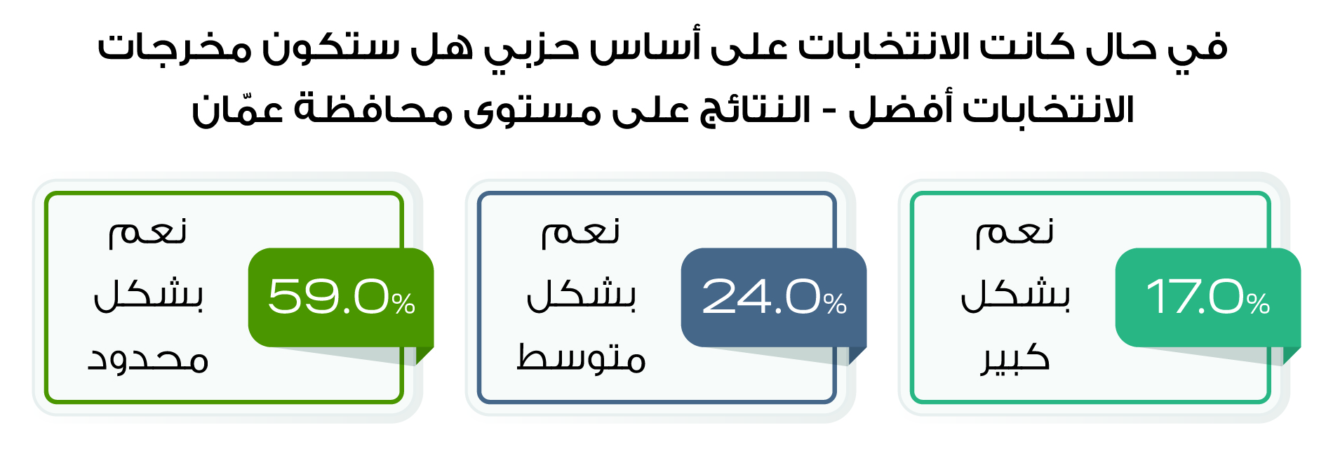 وأظهرت النتائج المستخلصة على مستوى العاصمة عمان أن 17% من المستجيبين والمستجيبات على مستوى العاصمة قالوا بأن مخرجات الانتخابات ستكون أفضل بشكل كبير لو كانت على أساس حزبي، فيما قال 24% من المستجيبين أن المخرجات ستكون أفضل بشكل متوسط، بينما كان 59% من المستجيبين أن المخرجات تكون أفضل بشكل محدود لو كانت الانتخابات على أساس حزبي.