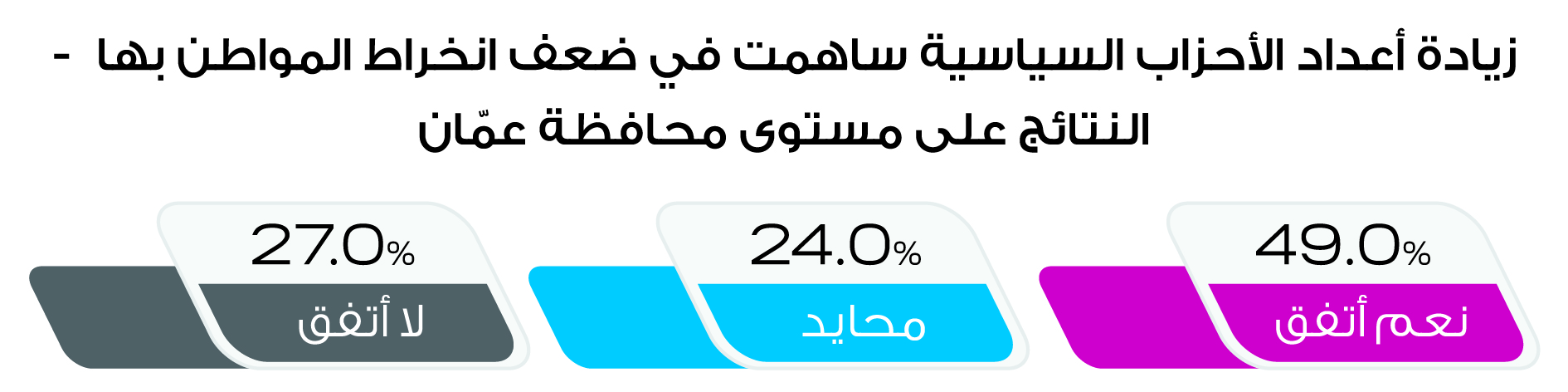 وفي ذات السياق اتفق 49% من المستجيبين والمستجيبات على مستوى العاصمة عمان على أن زيادة عدد الأحزاب ساهمت في إضعاف انخراط المواطنين بها، فيما قال 27% من المستجيبين والمستجيبات أنهم لا يتفقون مع أن زيادة عدد الأحزاب أضعفت انخراط المواطن بها، بينما كان 24% من المستجيبين والمستجيبات محايدون.