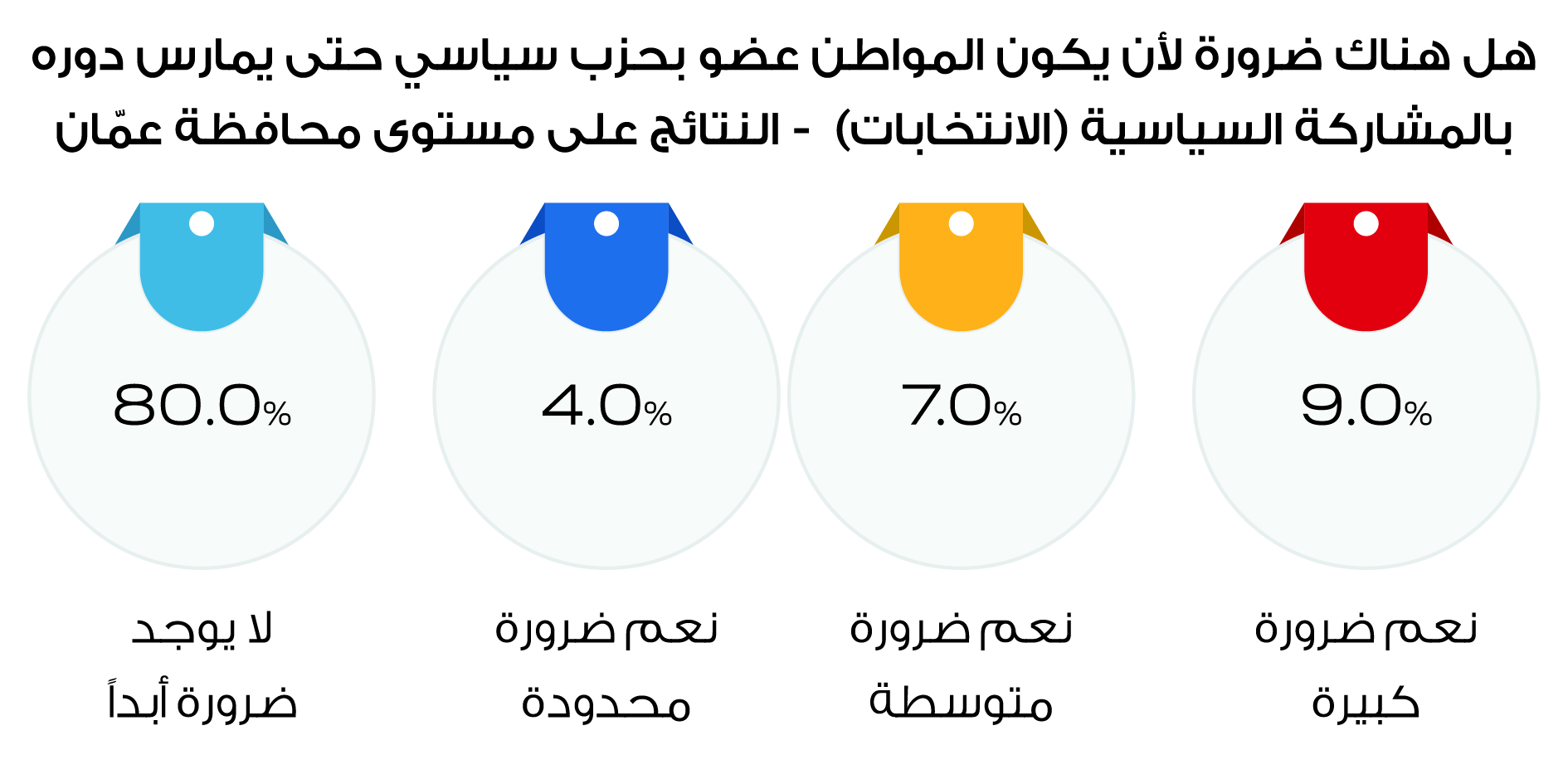 واستكمالاً لتوجهات الناخبين على مستوى العاصمة عمان فقد قال 80% من المستجيبين والمستجيبات أنه لا يوجد ضرورة أبداً لأن يكون المواطن عضواً بحزب سياسي حتى يمارس دوره بالمشاركة السياسية، فيما قال 9% أن هنالك ضرورة كبيرة، بينما قال 7% هنالك ضرورة متوسطة، وأخيراً قال 4% أن هنالك ضرورة محدودة لأن يكون المواطن عضواً في حزب سياسي حتى يمارس دوره بالمشاركة السياسية.