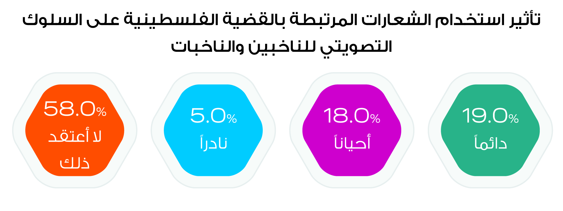 وعلى صعيد الشعارات المرتبطة بالقضية الفلسطينية يرى 58% أن سلوكهم التصويتي لا يتأثر إذا استعمل المترشحون أو المترشحات شعارات مرتبطة بالقضية الفلسطينية، بينما يرى 19% أن سلوكهم التصويتي يتأثر دائماً، و18% يرون أن سلوكهم التصويتي يتأثر أحياناً، فيما يرى 5% أنهم نادراً ما يتأثر سلوكهم التصويتي إذا ما استعمل المترشحون أو المترشحات الشعارات المرتبطة بالقضية الفلسطينية.