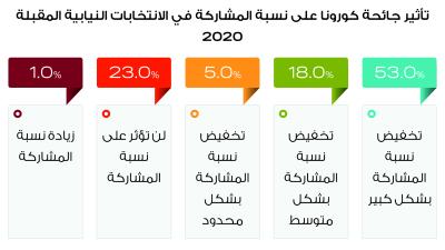 وبما يتعلق بأثر جائحة كورونا على نسبة المشاركة فقد عبر 53% عن رأيهم بأن الجائحة ستعمل على تخفيض نسب المشاركة بشكل كبير، بينما قال 18% أن الجائحة ستعمل على تخفيض نسب المشاركة بشكل متوسط، و5% قالوا بأن الجائحة ستعمل على تخفيض نسب المشاركة بشكل محدود، فيما قال 1% فقط أن الجائحة ستزيد من نسب المشاركة، و23% قالوا بأن الجائحة لن تؤثر على نسبة المشاركة في الانتخابات.