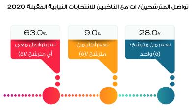 وبخصوص تواصل المرشحين والمرشحات مع قواعد الانتخابية بشكل مباشر فقد أجاب 63% أنه لم يتواصل معهم أي من المرشحين والمرشحات، بينما قال 28% من المستجيبون والمستجيبات أنه تم التواصل معهم من قبل مرشحة أو مرشح واحد فقط، وتواصل أكثر من مرشح أو مرشحة مع 9% من المستجيبون والمستجيبات.