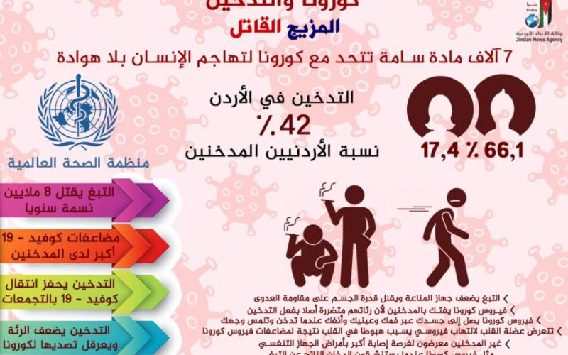 وينشر المدخنون فيروس كورونا في محيطهم المباشر ما يزيد من احتمالية نقل العدوى للآخرين، كما أن التدخين يضاعف الضرر والضغط على الرئتين عند إصابة المدخنين بالفيروس في وقت لا تجد فيه الرئة منسوبا كافيا من الأكسجين المتدفق إليها يقول الزعتري، وأن عدم تهاوي المدخنين أمام الجائحة يدعوهم للمسارعة فورا للإقلاع عن تعاطي منتجات التبغ.