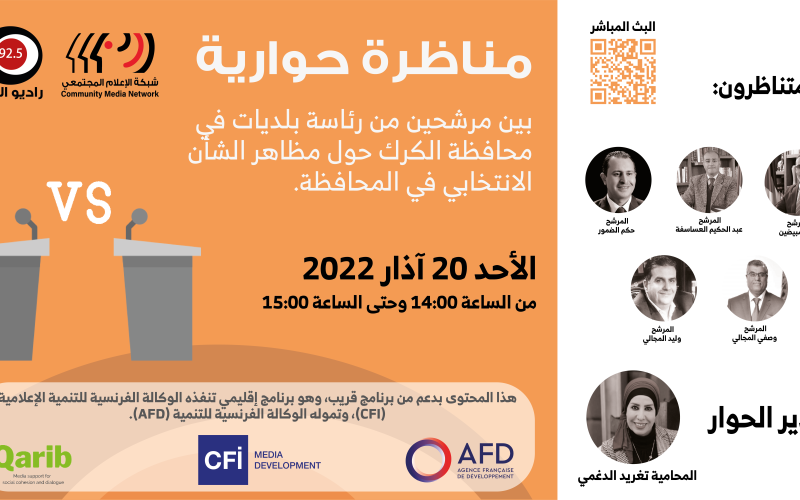 مناظرة حوارية بين مرشحين من رئاسة بلديات في محافظة الكرك، حول مظاهر الشأن الانتخابي في المحافظة. وذلك من الساعة 2:00 وحتى 3:00 من ظهر اليوم.