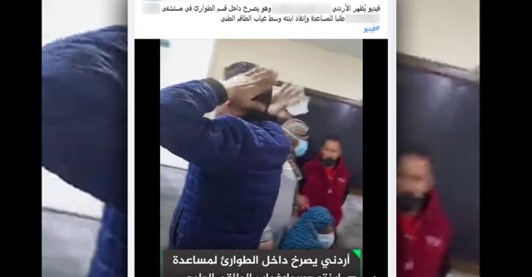 نشرت وسيلة إعلام عربية، تغطي قضايا الأردن، مقطع ً ا مصو ّ ر ً ا عبر صفحتها الموثقة على موقع التواصل الاجتماعي "فيسبوك"، يظهر فيه مواطن "يصرخ" طالبًا إنقاذ ابنته المستلقية على سرير في قسم الطوارئ