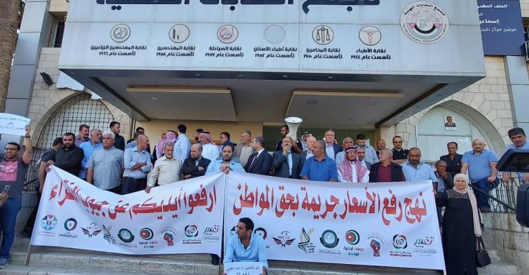 اعتصم عشرات المواطنين والناشطين الحزبيين، مساء الأحد، أمام مجمع النقابات المهنية في العاصمة عمان، احتجاجا على قرارات الحكومة المتتالية برفع أسعار السلع والتي كان آخرها رفع أسعار المحروقات. وقال أمين