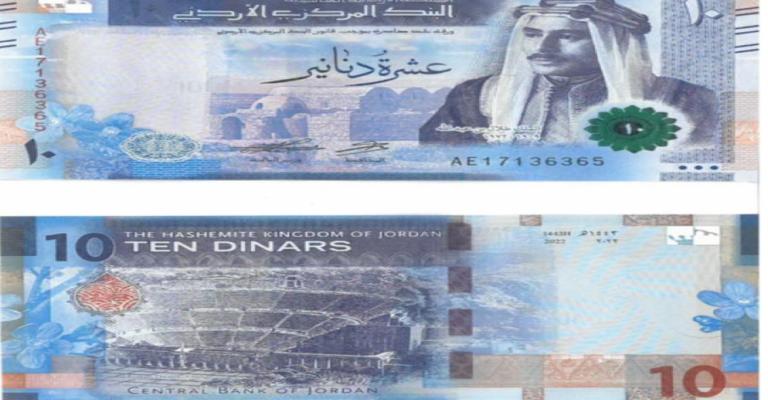 أعلن البنك المركزي الأردني عن بدء طرح فئة العشرة دنانير/ الإصدار الخامس في التداول، والتي يزين وجهها صورة جلالة الملك طلال بن عبد الله، اعتباراً من الاربعاء جنباً إلى جنب مع فئة العشرة دنانير/ الإصدار