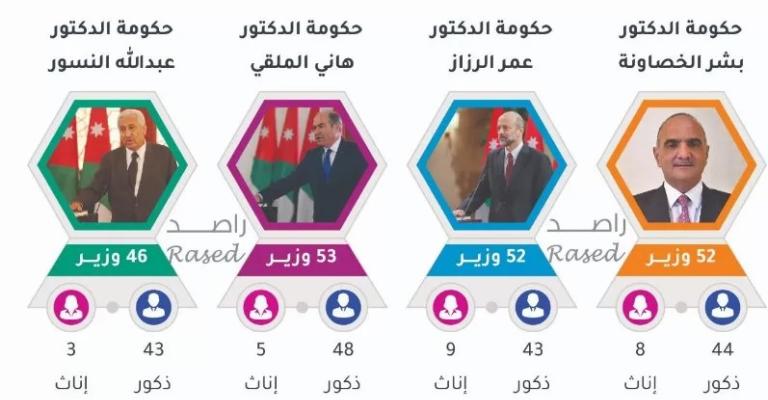 أظهر تحليل مركز الحياة راصد أن تعداد الوزراء في حكومة الدكتور بشر الخصاونة وصل إلى 52 وزيراً منهم 8 نساء، ووصل تعداد الوزراء الذين تولوا منصب وزير لأول مرة إلى 25 وزيراً، و27 وزيراً كانوا وزراءً