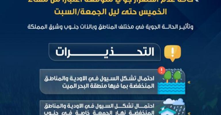 حذر المركز الوطني للأمن وإدارة الازمات من حالة عدم الاستقرار الجوي المتوقعة اعتبارا من مساء الخميس حتى ليل الجمعة/السبت، وتأثيرها في مختلف المناطق وبالذات جنوب وشرق المملكة. وحذر المركز من احتمال تشكل