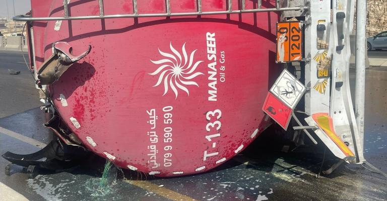 تتعامل الدوريات الخارجية مع حادث تدهور لمركبة شحن ( صهريج) محمل بإحدى المشتقات النفطية على طريق المطار مقابل جامعة الاسراء باتجاه عمان ، نجم عن الحادث اصابة متوسطة ويوجد إعاقة للطريق وتسريب للحمولة
