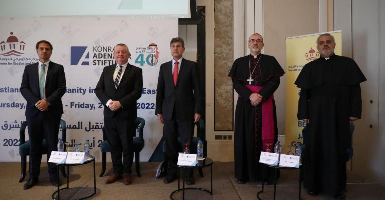 انطلقت في العاصمة عمّان، اليوم الخميس، أعمال مؤتمر "واقع ومستقبل المسيحيين في الشرق"، الذي ينظمه المركز الكاثوليكي للدراسات والإعلام، بالتعاون مع مؤسسة كونراد أديناور الألمانيّة، ويستمرّ ليومين