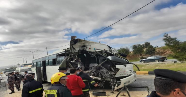 ارتفع عدد اصابات حادث تصادم حافلة و شاحنة نقل (قلاب) ما بعد جسر النعيمة، وتحديدا على مثلث كتم باتجاه اربد ، الى 41 شخصا. وأفاد مندوب ادارة الدوريات الخارجية لإذاعة "أمن إف إم"، أن الحادث وقع بحدود