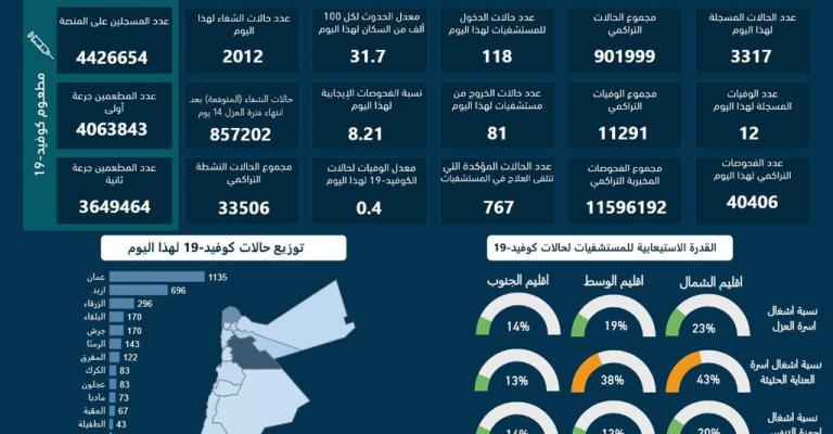 أعلنت وزارة الصحة، الأربعاء، عن تسجيل 12 وفاة و3317 إصابة جديدة بفيروس كورونا في المملكة، ليرتفع العدد الإجمالي إلى 11291 وفاة و901999 إصابة. وبلغت نسبة الفحوصات الإيجابيّة لهذا اليوم 8.21 بالمئة،