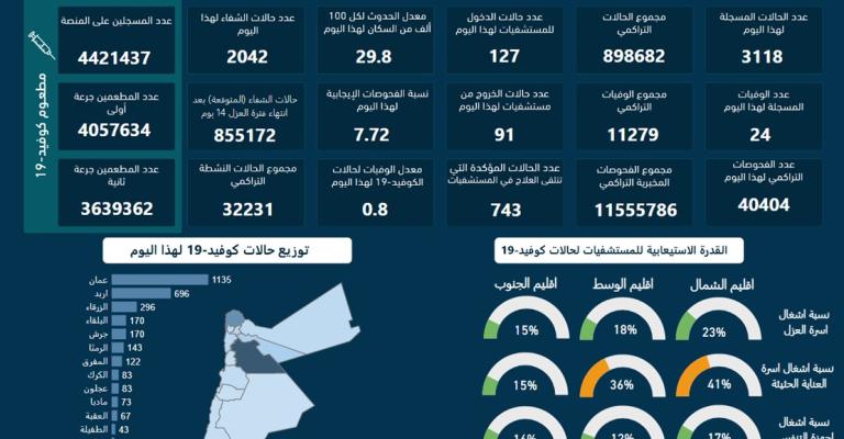 أعلنت وزارة الصحة، الثلاثاء، عن تسجيل 24 وفاة و3118 إصابة جديدة بفيروس كورونا في المملكة، ليرتفع العدد الإجمالي إلى 11279 وفاة و898682 إصابة. وبلغت نسبة الفحوصات الإيجابيّة لهذا اليوم 7.72 بالمئة،