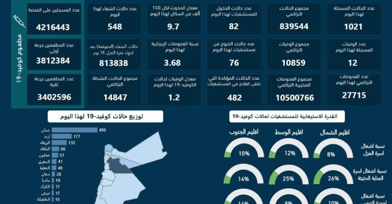 أعلنت وزارة الصحة الجمعة، عن تسجيل 12 وفاة و1021 إصابة جديدة بفيروس كورونا، ليرتفع العدد الإجمالي إلى 10859 وفاة و839544 إصابة.