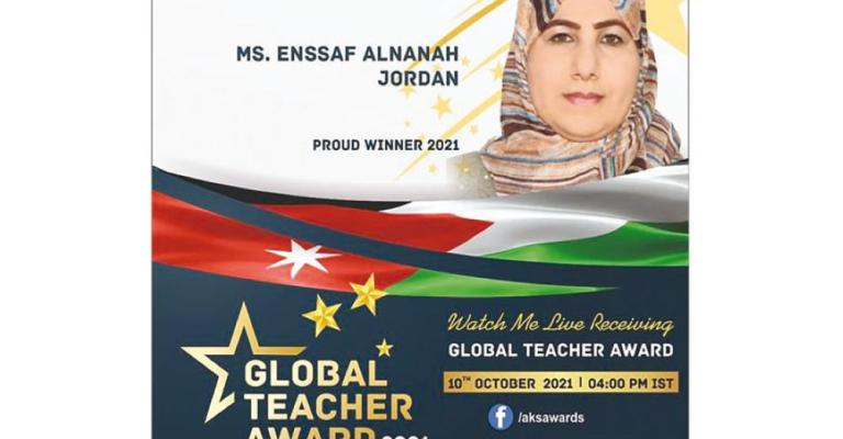 حصلت المعلمة الأردنية من مدرسة فاطمة الزهراء الاساسية للبنات في محافظة الطفيلة إنصاف النعانعة على جائزة المعلم العالمي لعام 2021 من بين 26 ألف مرشح للجائزة. وبدأت الجائزة في موسمها الأول عام 2018