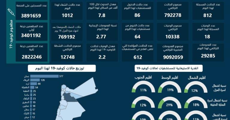 أعلنت وزارة الصحة تسجيل 18 وفاة و812 إصابة جديدة بفيروس كورونا في الأردن، ليرتفع العدد الإجمالي إلى 10338 وفاة، و792278 إصابة، ونسبة الفحوصات الإيجابيّة نحو 2.77 بالمئة. وبين الموجز الإعلامي الصادر عن