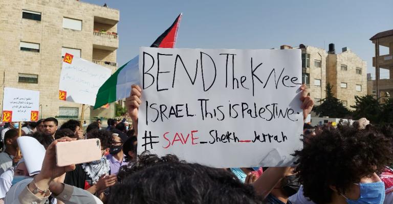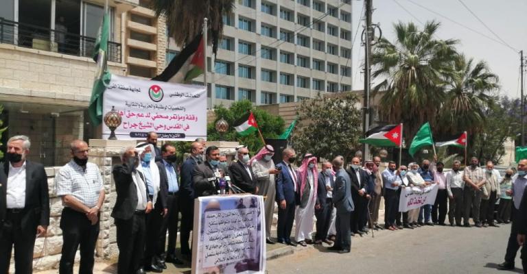 انطلقت عصر اليوم الاثنين في منطقة الرابية بالعاصمة عمّان، وقفة احتجاجية قرب سفارة الاحتلال، تنديدا بجرائم وممارسات شرطة وجيش الاحتلال في المسجد الأقصى المبارك، وحي الشيخ جراح بالقدس. ووحدت القوى