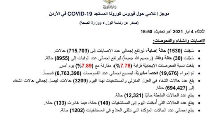 موجز إعلامي حول فيروس كورونا المستجد COVID-19 في الأردن (صادر عن رئاسة الوزراء ووزارة الصحة) الثلاثاء 4 أيار 2021 آخر تحديث: 15:50 الإصابات والشفاء والفحوصات: • سُجِّلت (1530) حالة إصابة، ليرتفع