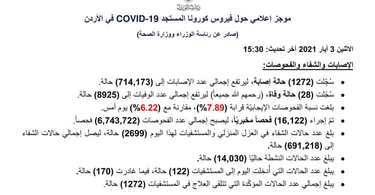 موجز إعلامي حول فيروس كورونا المستجد COVID-19 في الأردن (صادر عن رئاسة الوزراء ووزارة الصحة) الاثنين 3 أيار 2021 آخر تحديث: 15:30 الإصابات والشفاء والفحوصات: -سُجِّلت (1272) حالة إصابة، ليرتفع إجمالي