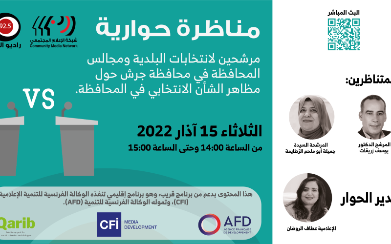 مناظرة حوارية بين مرشحين لانتخابات البلدية ومجالس المحافظة في محافظة جرش حول مظاهر الشأن الانتخابي في المحافظة. وذلك من الساعة 2:00 وحتى 3:00 من ظهر اليوم.