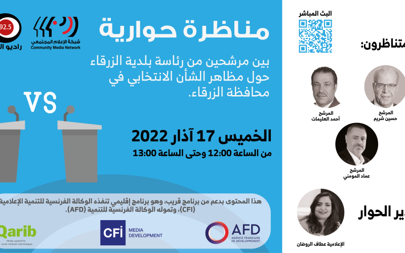 مناظرة حوارية بين مرشحين من رئاسة بلدية الزرقاء حول مظاهر الشأن الانتخابي في محافظة الزرقاء. وذلك من الساعة 12:00 وحتى 1:00 من ظهر اليوم.