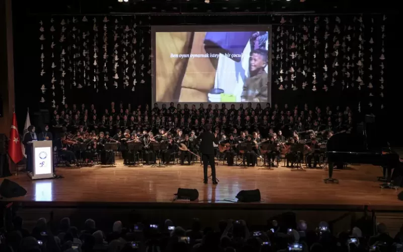 وأُقيم الحفل في المركز الثقافي التابع لجامعة "أولوداغ"، بمشاركة أوركسترا وجوقة ضخمة مؤلفة من 220 طالبا. وقدّم المشاركون عدة أغان تعبر عن معاناة الشعوب المضطهدة حول العالم.