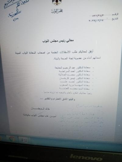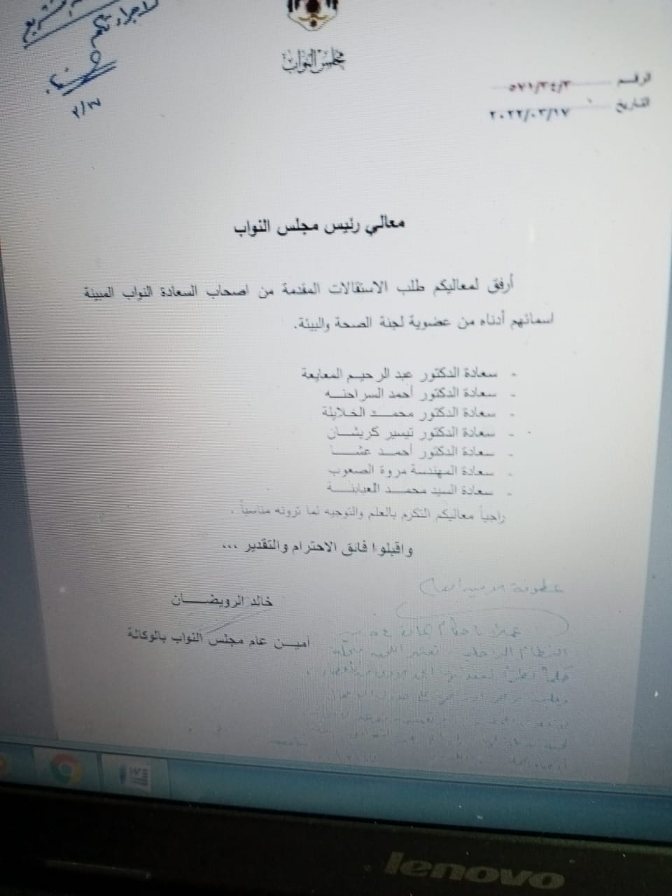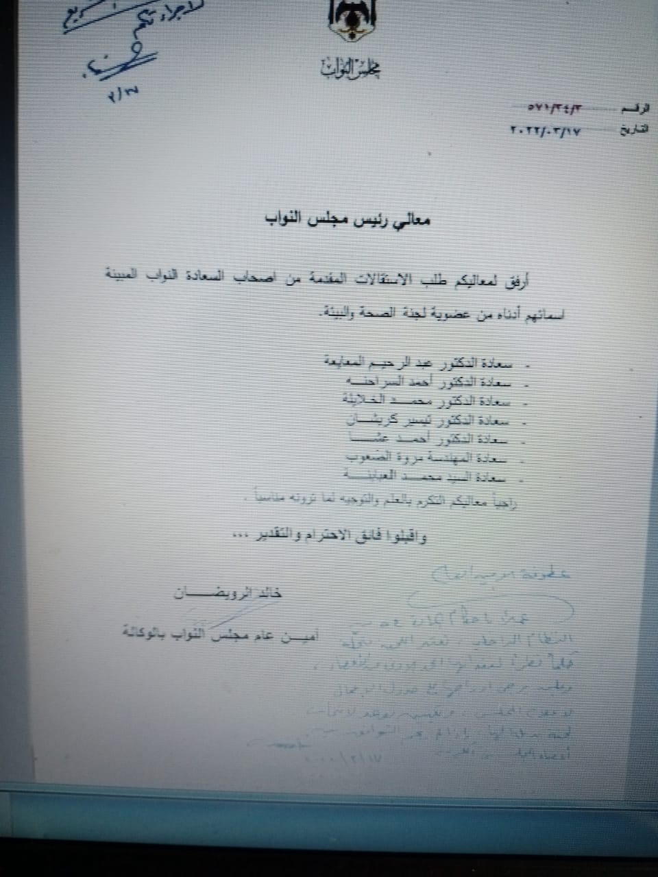واستقال من عضوية اللجنة كل من النواب مقرر اللجنة د. عبد الرحيم المعايعه، ود. أحمد السراحنه، ود. محمد الخلايله، ود. تيسير كريشان، ود. أحمد عشا، وم. مروة الصعوب، ومحمد العبابنه.