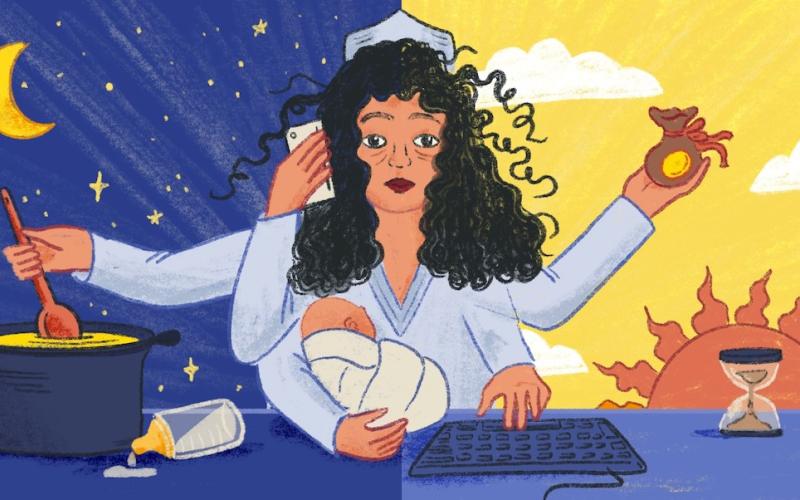 علاوة على ذلك، أضافت جائحة كوفيد-19 طبقة أخرى إلى الشعور بالضيق المنتشر في العصر الحديث، الذي يسببّه فقر الوقت. يشير مفهوم "فقر الوقت" إلى ضيق الوقت "للعيش"، والذي يعاني منه الأفراد المثقلون بأعباء العمل غير المأجور – وغالبيتهن نساء – بالإضافة إلى مسؤوليات إعالة الأسرة، مما يترك للمرء قليلاً من الوقت للتنفس. تتأثر هذه العملية بشكل مباشر بالسياسات المطروحة وديناميات السوق، فضلاً عن التأثير الواضح للأعراف الاجتماعية والقوالب النمطية الجندرية التي تملي تقسيم العمل داخل الأسر وضمن المجتمعات. وغني عن الذِّكر أن المرأة في كل المجتمعات تقريباً، هي التي تقوم بأعباء الرعاية، الأمرُ الذي غالباً ما يعتبر أمراً مفروغاً منه.