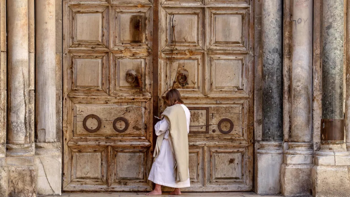 الأحد الماضي، فرغت أزقة البلدة القديمة في القدس من الناس، لكن رجلا متشبها بالمسيح، أرخى شعره وارتدى رداء أبيض وسار حافي القدمين، كسر صمت المدينة إذ شوهد يتكئ على عصا حاملا الكتاب المقدس ويصلي في ساحة كنيسة القيامة أمام أبوابها الخشبية المغلقة.