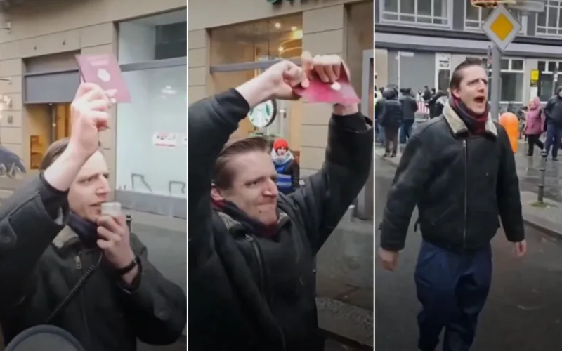 بعدها أمسك المواطن الألماني بجواز سفره بكلتا يديه وقام بتمزيقه ثم ألقاه على الأرض أمام حشد من الناس في الشارع كانوا يرفعون أصواتهم تأييدا له.