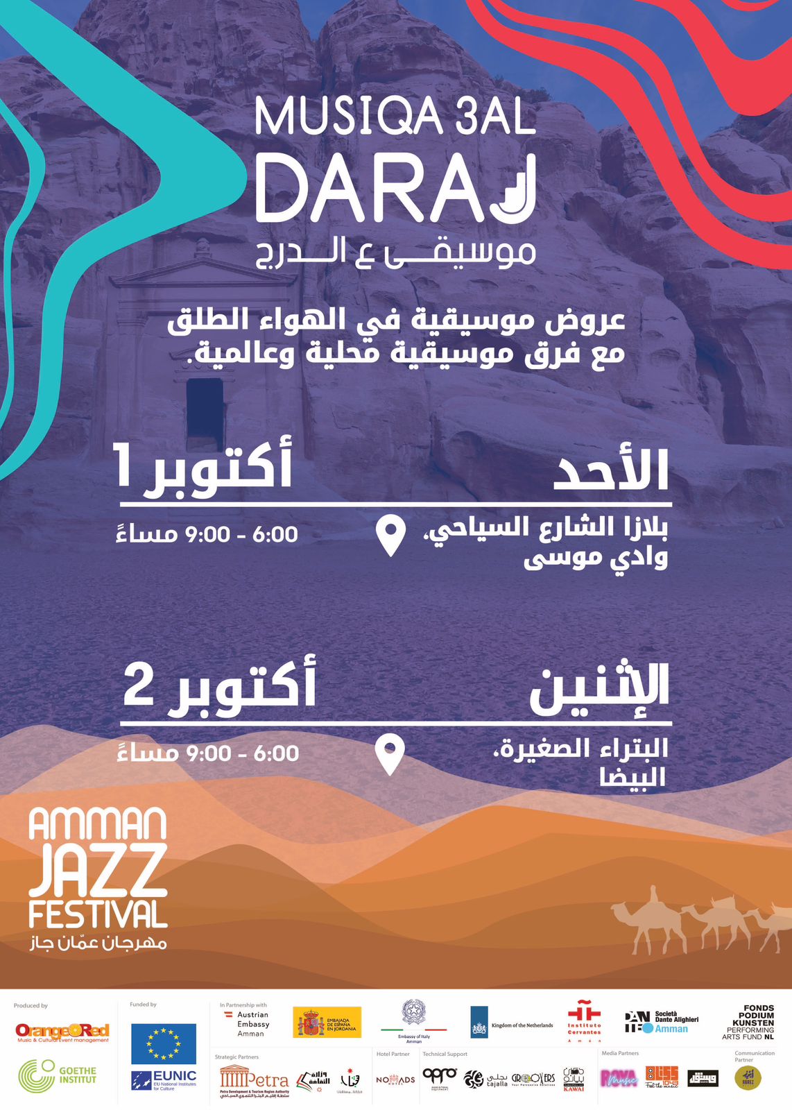 عمان- تحت مظلة مهرجان "عمان جاز" الحادي عشر، تنطلق فعاليات "موسيقى عالدرج" بدورتها الخامسة ولأول مرة في مدينة البترا يوم الأحد 1 أكتوبر وتستمر حتى 2 أكتوبر، وبتنظيم وانتاج مشترك ما بين "أورانج ريد" ومعهد غوته عمان لتقدم للجمهور الأردني والسياح في المساحات العامة 8 عروض متنوعة لموسيقيين وفنانين من الأردن ودول عربية وأوروبية؛ تجمع ما بين موسيقى الجاز والموروث العربي وغيرها من الألوان الموسيقية،